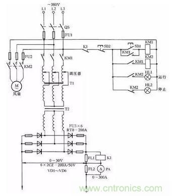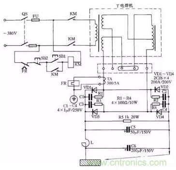 電路中VD1~VD4為4只硅整流二極管;R1~R4、C1~C4組成硅整流器件的過壓保護電路;FR為過流繼電器,保護硅整流器件。當負載電流超過額定值時,電流互感器次級電流相應增加,帶動繼電器FR動作,F(xiàn)R常閉觸點打開,接觸器KM釋放,觸點打開切斷電焊機電源。硅整流器件用0.25kW風扇作風冷設備。圖中,C5為濾波電容,R5為泄放電阻。