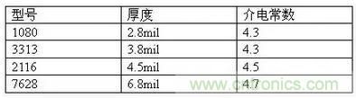 介電常數:半固化片的介電常數與厚度有關,下表為不同型號的半固化片厚度和介電常數參數: