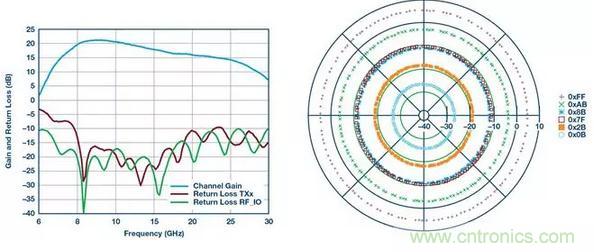 圖5顯示了具有全360°相位覆蓋的增益和相位控制,可以實現小于2.8°的相位步長和優于31 dB的增益控制。ADAR1000集成片上存儲器,可存儲多達121個波束狀態,其中一個狀態包含整個IC的所有相位和增益設置。發射器提供大約19 dB的增益和15 dBm的飽和功率,其中接收增益約為14 dB。另一個關鍵指標是增益控制的相位變化,其在20 dB范圍內約為3°。同樣,在整個360°相位覆蓋范圍內,相位控制的增益變化約為0.25 dB,緩解了校準難題。