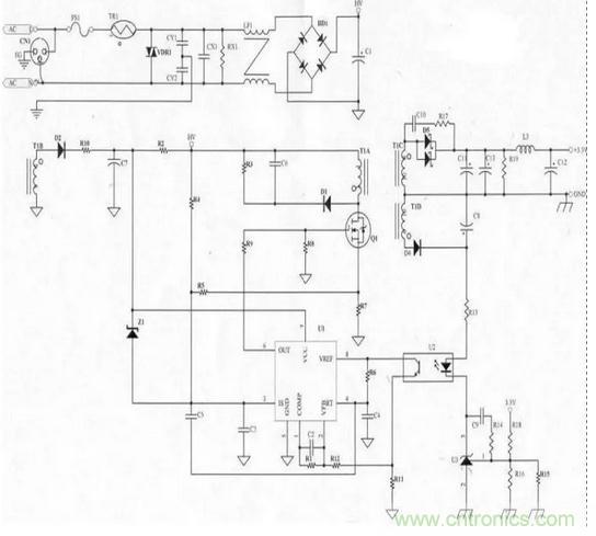 主要用于調整PWM IC的VCC電壓,以目前使用的3843而言,設計時VCC必須大于8.4V(Min. Load時),但為考慮輸出短路的情況,VCC電壓不可設計的太高,以免當輸出短路時不保護(或輸入瓦數過大)。