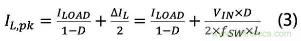 假設升壓轉換器在連續導通模式 ( Continuous Conduction Mode, CCM) 下工作,峰值電感電流可從公式(1)和(2)得出,具體計算如下: