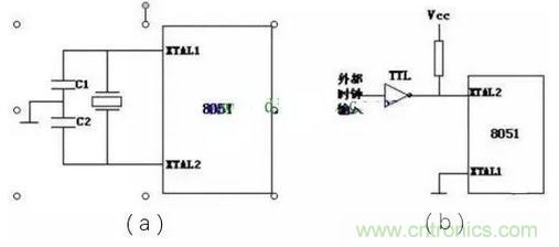 時(shí)鐘電路:(a)內(nèi)部方式時(shí)鐘電路,(b)外接時(shí)鐘電路
