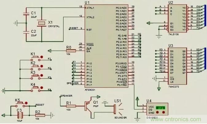 當(dāng)按1次K3進(jìn)入鬧鐘設(shè)置界面,時(shí)鐘繼續(xù)進(jìn)行走時(shí),按K2對(duì)秒進(jìn)行設(shè)置;當(dāng)按2次K3,按K2對(duì)分進(jìn)行設(shè)置;當(dāng)按3次K3,按K2對(duì)秒進(jìn)行設(shè)置;當(dāng)按下4次K3時(shí),鬧鐘設(shè)置完畢進(jìn)入時(shí)鐘顯示界面。電路圖如下: