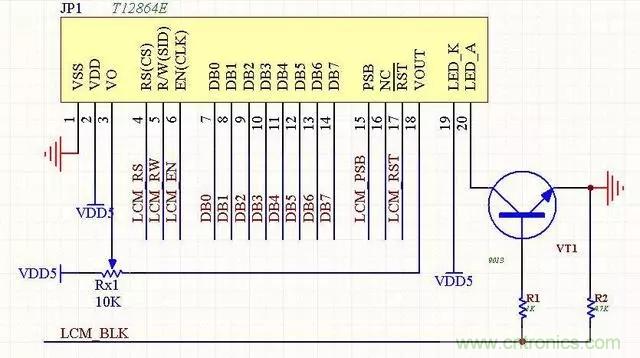 7、LCM12864液晶模塊(ST7920)本電路是常見的12864電路,價格便宜,帶中文字庫。可以通過PSB端口的電平來設置其工作在串口模式還是并行模式,帶背光控制功能。