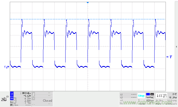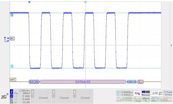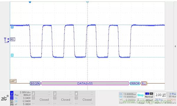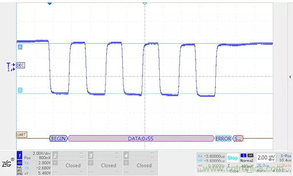 在顯性狀態期間,總線的寄生電容會被充電,而在恢復到隱性狀態時,這些電容需要放電。如果CANH、CANL之間沒有放置任何阻性負載,電容只能通過收發器內部的差分電阻放電。我們在收發器的CANH、CANL之間加入一個220PF的電容進行模擬試驗,位速率為500kbit/s,波形如下圖所示。
