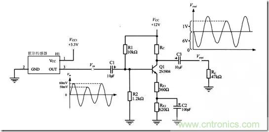 R2 = 1.2KΩ,R1 = 10KΩ,Rc = 10KΩ,Re1 = 360Ω,Re2 = 640Ω;放大倍數為20;