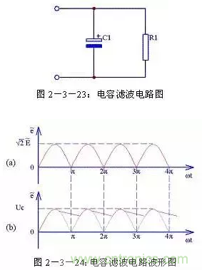 電容濾波電路圖見圖2-3-23,電容濾波電路是利用電容的充放電原理達到濾波的作用。在脈動直流波形的上升段,電容C1充電,由于充電時間常數(shù)很小,所以充電速度很快;在脈動直流波形的下降段,電容C1放電,由于放電時間常數(shù)很大,所以放電速度很慢。在C1還沒有完全放電時再次開始進行充電。這樣通過電容C1的反復(fù)充放電實現(xiàn)了濾波作用。濾波電容C1兩端的電壓波形見圖2-3-24(b)。