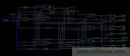 有了完整規畫后,接下來便是畫出平面的設計藍圖。在 IC 設計中,邏輯合成這個步驟便是將確定無誤的 HDL code,放入電子設計自動化工具(EDA tool),讓電腦將 HDL code 轉換成邏輯電路,產生如下的電路圖。之后,反覆的確定此邏輯閘設計圖是否符合規格并修改,直到功能正確為止。