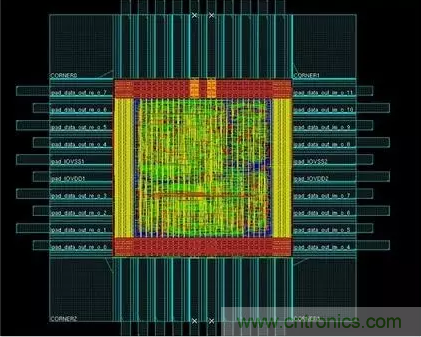 最后,將合成完的程式碼再放入另一套 EDA tool,進行電路布局與繞線(Place And Route)。在經過不斷的檢測后,便會形成如下的電路圖。圖中可以看到藍、紅、綠、黃等不同顏色,每種不同的顏色就代表著一張光罩。至于光罩究竟要如何運用呢?