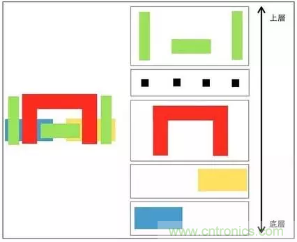 下圖中,左邊就是經過電路布局與繞線后形成的電路圖,在前面已經知道每種顏色便代表一張光罩。右邊則是將每張光罩攤開的樣子。制作是,便由底層開始,依循上一篇 IC 芯片的制造中所提的方法,逐層制作,最后便會產生期望的芯片了。