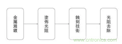 金屬濺鍍:將欲使用的金屬材料均勻灑在晶圓片上,形成一薄膜。