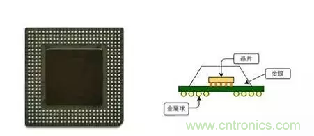 至于球格陣列(Ball Grid Array,BGA)封裝,和 DIP 相比封裝體積較小,可輕易的放入體積較小的裝置中。此外,因為接腳位在芯片下方,和 DIP 相比,可容納更多的金屬接腳相當適合需要較多接點的芯片。然而,采用這種封裝法成本較高且連接的方法較復雜,因此大多用在高單價的產品上。