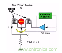 如果對這個組件施加加速度,就會對質(zhì)量施加一個力,它將試圖從零位置移動。當(dāng)零檢測器檢測到運(yùn)動時,通過伺服放大器增加線圈電流以保持零位置。