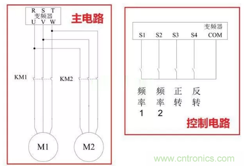 我們通過兩個(gè)接觸器實(shí)現(xiàn)變頻器對(duì)電機(jī)驅(qū)動(dòng)的切換,在控制部分我們采取最簡(jiǎn)單的使用外部端子來實(shí)現(xiàn)電機(jī)的啟動(dòng)、停止以及速度的調(diào)節(jié)。那對(duì)于雙速電機(jī),我們采用多段速調(diào)頻每個(gè)端子S1、S2就代表一個(gè)速度,這個(gè)速度的大小我們能在變頻器參數(shù)中進(jìn)行自定義設(shè)定比如20Hz,50Hz等。那對(duì)于正反轉(zhuǎn)控制電機(jī)就更簡(jiǎn)單了,我們只需要控制S3和S4端子的閉合就能實(shí)現(xiàn)。以上只是簡(jiǎn)單的舉例說明,在我們實(shí)際應(yīng)用當(dāng)中還要考慮變頻器與電機(jī)容量的關(guān)系,不能過載運(yùn)行,如果兩個(gè)電機(jī)參數(shù)不一樣,我們還必須對(duì)變頻器進(jìn)行詳細(xì)參數(shù)調(diào)節(jié),可以把兩臺(tái)電機(jī)的控制參數(shù)都輸入到變頻器中,到時(shí)候用到哪臺(tái)就調(diào)取其參數(shù)。比如頻率設(shè)定源組合、命令源、加減速時(shí)間、可以通過端子進(jìn)行切換。