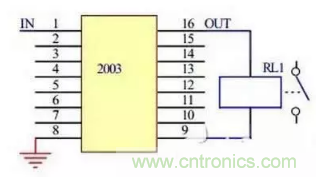 當(dāng)2003輸入端為高電平時(shí),對(duì)應(yīng)的輸出口輸出低電平,繼電器線圈兩端通電,繼電器觸點(diǎn)吸合;當(dāng)2003輸入端為低電平時(shí),對(duì)應(yīng)的輸出口呈高阻態(tài),繼電器線圈兩端斷電,繼電器觸點(diǎn)斷開(kāi)。