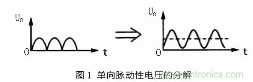 如圖 1(a)所示。是單向脈動性直流電壓波形,從圖中可以看出,電壓的方向性無論在何時都是一致的,但在電壓幅度上是波動的,就是在時間軸上,電壓呈現出周期性的變化,所以是脈動性的。但根據波形分解原理可知,這一電壓可以分解一個直流電壓和一組頻率不同的交流電壓,如圖 1(b)所示。在圖 1(b)中,虛線部分是單向脈動性直流電壓 U。中的直流成分,實線部分是 UO 中的交流成分。