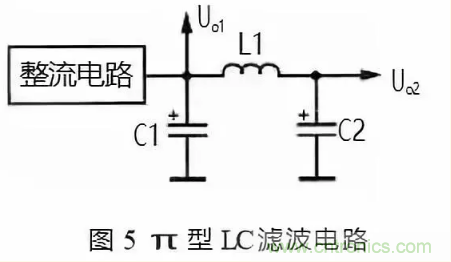 在圖 5 的電路中,整流電路輸出的單向脈動性直流電壓先經電容 C1 濾波,去掉大部分交流成分,然后再加到 L1 和 C2 濾波電路中。