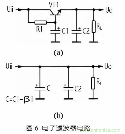 ① 電路中的 VT1、R1、C1 組成電子濾波器電路,這一電路相當于一 只容量為 C1×β1 大小電容器,β1 為 VT1 的電流放大倍數,而晶體管的電流放大倍數比較大,所以等效電容量很大,可見電子濾波器的濾波性能是很好的。等效電路如圖 6(b)所示。圖中 C 為等效電容。