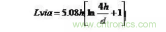 它的寄生串聯(lián)電感會(huì)削弱旁路電容的貢獻(xiàn),從而減弱整個(gè)電源系統(tǒng)的濾波效用。假設(shè)L為過孔的電感,h為過孔的長(zhǎng)度,d為中心鉆孔的直徑。過孔近似的寄生電感大小近似于:
