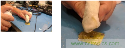 接下來用一些助焊劑清潔劑和一小塊布來清潔電路板。如下圖所示,將助焊劑清潔劑噴在布料上。用力壓住電路板,同時用沾有助焊劑清潔劑的濕布以畫圈的方式清潔電路板。