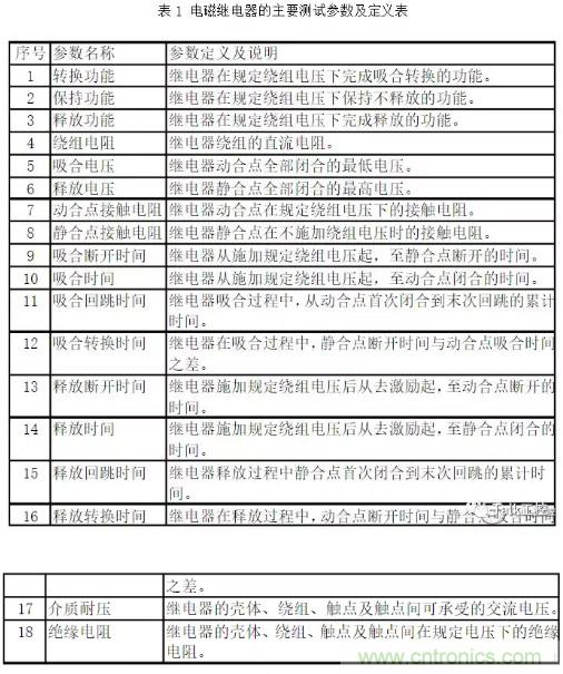 【導讀】為保證繼電器的質量,表1所列參數都應嚴格進行測試,但其中有些參數的測試特別需要引起我們的注意。本文將介紹繼電器主要測試參數的注意事項與方法。