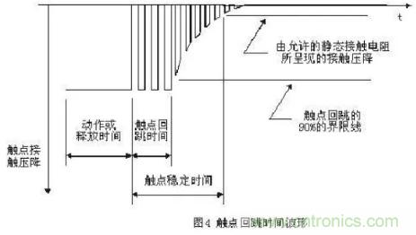 回跳時間包括吸合回跳時間和釋放回跳時間。由于繼電器是采用有彈性的機械觸點完成線路的接通和斷開,因此不同于由半導體器件組成的無觸點電子開關,當繼電器的觸點接通或斷開的瞬間會有一段不穩定的接觸期,典型的觸點波形見圖4。