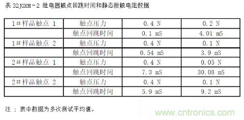 MIL-R-39016D和GJB 65A-91對觸點回跳做了定義:“等于或大于開路電壓的 90%,且脈沖寬度等于或大于 10 uS 的現象則認為是回跳”。同時明確規定觸點回跳時間不得超過 1.5 mS。有些用戶對回跳時間參數不以為然,認為觸點最終總會接通(或斷開),過程中有沒有回跳不影響繼電器的正常使用。這是一種錯誤的認識,軍標之所以規定回跳時間參數的測試,是因為繼電器的回跳時間同靜態接觸電阻參數一樣,反映了繼電器的觸點壓力,試驗證明,當繼電器的觸點壓力明顯衰退時,回跳時間會變長。表3顯示了繼電器樣品在試驗中觸點回跳時間和觸點壓力之間的關系。