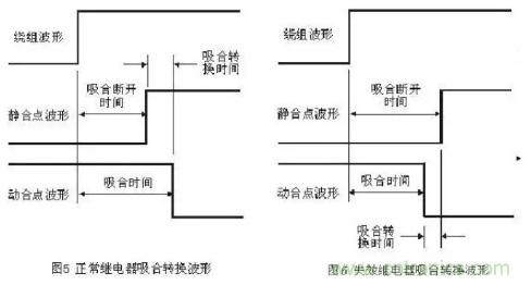 轉換時間包括吸合轉換時間和釋放轉換時間。以吸合轉換時間為例,繼電器在吸合過程中,靜合點斷開時間與動合點吸合時間之差稱為吸合轉換時間。圖5和圖6分別顯示了合格繼電器和失效繼電器的吸合轉換波形。
