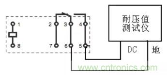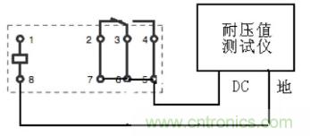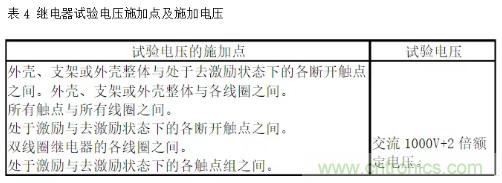 介質耐壓(俗稱打高壓)是考核繼電器的殼體、繞阻、觸點及觸點間在規定的時間內承受規定交流電壓的能力。而絕緣電阻是考核繼電器的殼體、繞阻、觸點及觸點間在效加規定直流電壓的條件下體現出來的絕緣電阻。國軍標規定的試驗電壓施加點見表4。