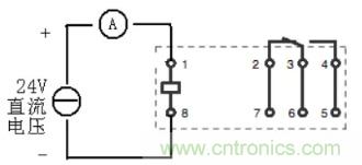 b、額定電流測試:對繼電器1、8腳供直流24V電,等30秒讀取電流表數據 注意:電流測試,萬用表表筆插至電流輸入端口,并調整電流檔對應的量程檔位(mA)。