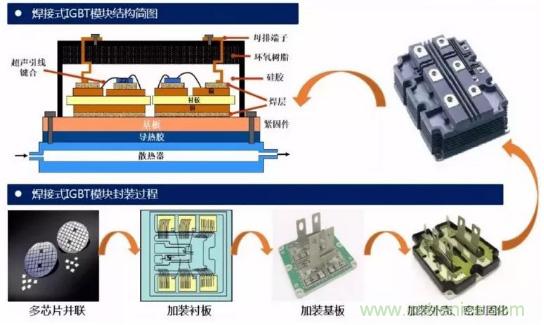 IGBT模塊按封裝工藝來(lái)看主要可分為焊接式與壓接式兩類。高壓IGBT模塊一般以標(biāo)準(zhǔn)焊接式封裝為主,中低壓IGBT模塊則出現(xiàn)了很多新技術(shù),如燒結(jié)取代焊接,壓力接觸取代引線鍵合的壓接式封裝工藝。