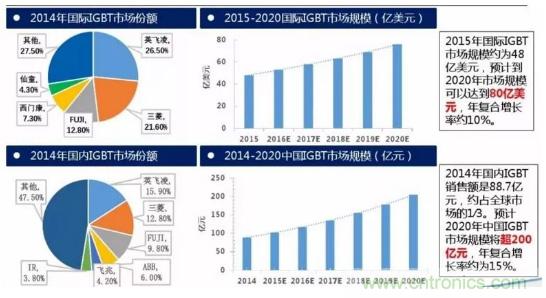 2015年國(guó)際IGBT市場(chǎng)規(guī)模約為48億美元,預(yù)計(jì)到2020年市場(chǎng)規(guī)模可以達(dá)到80億美元,年復(fù)合增長(zhǎng)率約10%。2014年國(guó)內(nèi)IGBT銷售額是88.7億元,約占全球市場(chǎng)的1∕3。預(yù)計(jì)2020年中國(guó)IGBT市場(chǎng)規(guī)模將超200億元,年復(fù)合增長(zhǎng)率約為15%。
