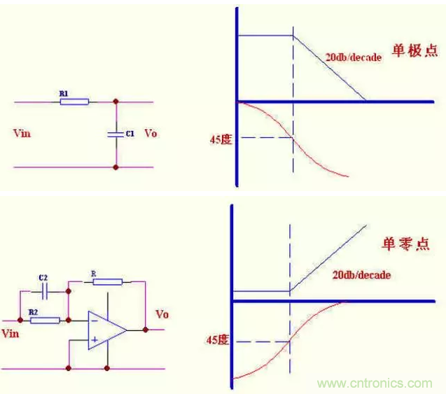 bode 圖可以簡單的判定電路的穩定性,甚至可以確定電路的閉環響應,就向我下面的圖中表示的.零,極點說明了增益和相位的變化。