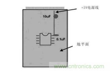 在布線(xiàn)時(shí),模擬器件和數(shù)字器件都需要這些類(lèi)型的電容,都需要靠近其電源引腳連接一個(gè)電容,此電容值通常為0.1uF。系統(tǒng)供電電源側(cè)需要另一類(lèi)電容,通常此電容值大約為10uF。