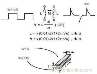 在這兩種走線(xiàn)配置中,一條走線(xiàn)上電流隨時(shí)間的變化(dI/dt),由于這條走線(xiàn)的感抗,會(huì)在同一條走線(xiàn)上產(chǎn)生電壓;并由于互感的存在,會(huì)在另一條走線(xiàn)上產(chǎn)生成比例的電流。如果在第一條走線(xiàn)上的電壓變化足夠大,干擾可能會(huì)降低數(shù)字電路的電壓容限而產(chǎn)生誤差。并不只是在數(shù)字電路中才會(huì)發(fā)生這種現(xiàn)象,但這種現(xiàn)象在數(shù)字電路中比較常見(jiàn),因?yàn)閿?shù)字電路中存在較大的瞬時(shí)開(kāi)關(guān)電流。