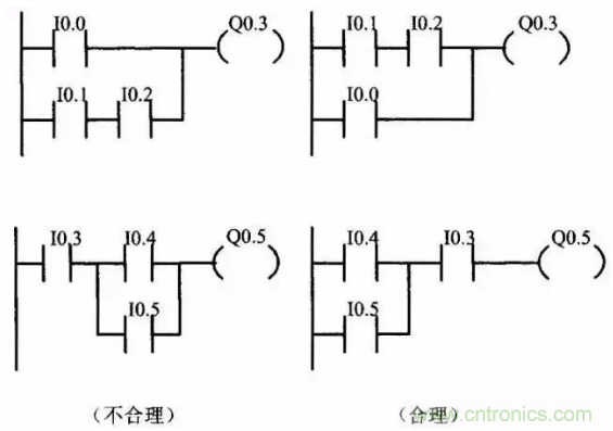 (3)幾個串聯支路相并聯,應將觸點多的支路安排在上面;幾個并聯回路的串聯,應將并聯支路數多的安排在左面。按此規則編制的梯形圖可減少用戶程序步數,縮短程序掃描時間。