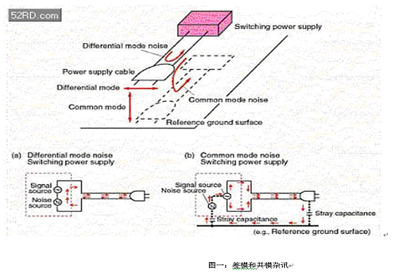 由EMI產生的雜訊也分成兩類:差模雜訊和共模雜訊。簡言之,差模雜訊是當兩條電源供應線路的電流方向互為相反時發生的,如圖1(a)所示。而共模雜訊是當所有的電源供應線路的電流方向相同時發生的,如圖1(b)所示。一般而言,差模訊號通常是我們所要的,因為它能承載有用的資料或訊號;而共模訊號(雜訊)是我們不要的副作用或是差模電路的“副產品”,它正是EMC的最大難題。從圖一中,可以清楚發現,共模雜訊的發生大多數是因為“雜散電容(stray capacitor)”的不當接地所造成的。這也是為何共模也稱作“接地泄漏模式”的原因。