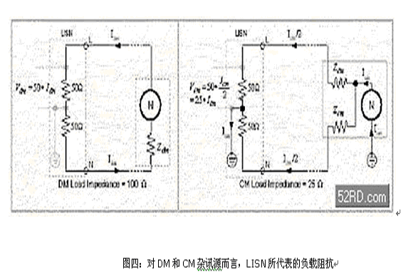 為了了解VL和VN,請參考圖四。共模電壓是25Ω乘以流向E的電流值(或者是50Ω乘以Icm/2)。差模電壓是100Ω乘以差模電流。因此,LISN提供下列的負載阻抗給雜訊源(沒有任何的輸入濾波器存在):