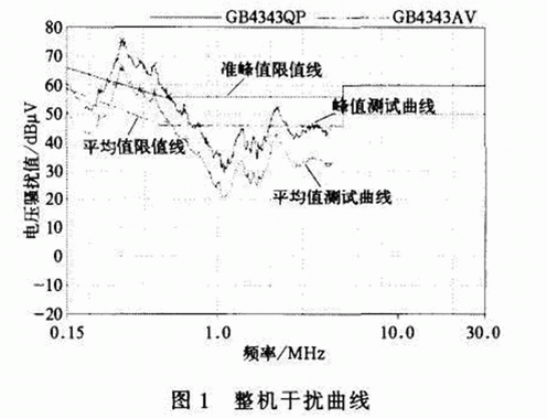 圖1是某一臺空調產品連續干擾電壓的測試曲線(執行GtM343.1—2003《家用和類似用途電動、電熱器具,電動工具以及類似電器無線電干擾特性測量方法和允許值》l11)。表1是超出限值的一些頻率點及連續干擾電壓的峰值和平均值的測量值。