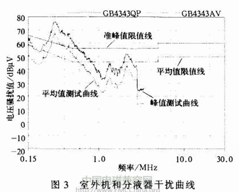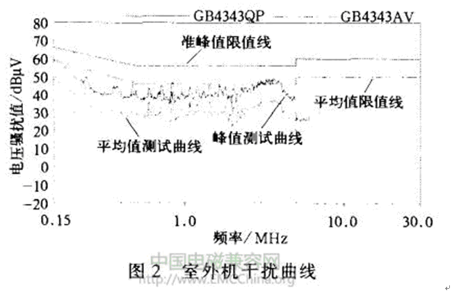 從圖2可以看出,測量的連續干擾電壓的峰值曲線和平均值曲線均沒有超過限值線,且有一定的裕量,由此可以排除室外機控制器和壓縮機干擾的可能。