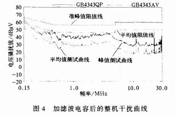 由圖4和表2可以看出,在加了濾波電容后,超出限值線的干擾均被濾掉。在實際應用中,單一的電容器不可能在從低頻段到高頻段都能令人滿意。這種情況下可以將兩個不同類型的電容器并聯使用,會取得良好的效果。