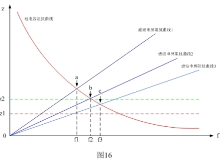 圖16表示C5電容與L0、L1、L2等電感濾波器的頻率-阻抗特性圖。圖16中紅線表示設備對地電容C5的頻率阻抗曲線;藍線是濾波電感L0、L1、L2的頻率阻抗曲線。