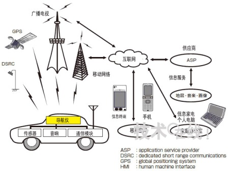 首先介紹車載導航儀的多功能化和高速化。眾所周知,車載導航儀的出發點是導航,然后才是通過DSRC(Dedicated Short Range Communications )、電視、移動網絡等通信手段與車外相連接。現在,車載導航儀已不再是單純的指路工具,而是發展成為了能夠借助各類供應商進行多種內容交換的雙向交流裝置。為了向駕駛員提供安全、放心、便利、舒適的駕駛環境,車載導航儀正在向聯結人與機械(這里指汽車)的HMI(Human Machine Interface)中心轉變(圖1)。