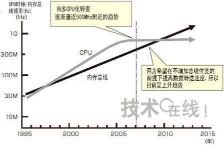 其原動力毋庸置疑是CPU的進步(即計算機系統的大規模化和時鐘的高速化)。車載導航儀的CPU時鐘和內存總線時鐘頻率近來得到了快速提高(圖4)。CPU時鐘頻率正在逼近上限,今后,提高性能可能要依賴在一個LSI內配置多個CPU的多CPU化進程。而另一方面,DRAM的內存總線還在以不增加位寬的前提下提高性能,因此,時鐘頻率的上升勢不可擋。