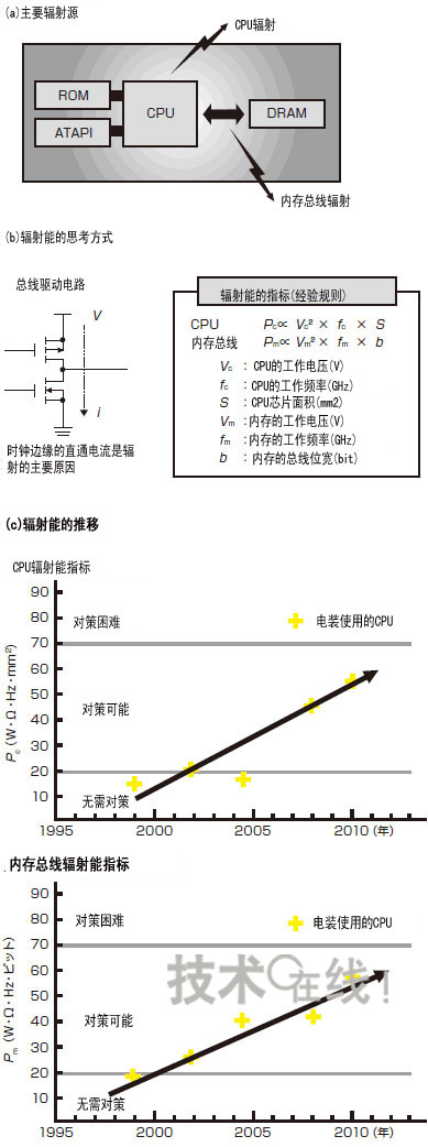 芯片面積和時鐘頻率的增加容易導致輻射電磁噪聲增大。因此,對這些輻射源的輻射進行預測管理會逐漸成為重要環節。對于車載導航儀的核心(Navi-Core),如圖5(a)所示,CPU和總線是主要輻射源。由經驗可知,直接來自于CPU的輻射能指標Pc與工作電壓的平方、工作頻率、芯片面積分別成正比,這些數值的積被作為“輻射能指標”應用到了預測管理(圖5(b)注1)之中。內存總線的輻射能指標Pm也同樣與工作電壓的平方、工作頻率、內存總線位寬的積成正比。[page]