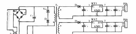 輸入為交流85~200V,經功率二極管整流橋變為直流,作為DC/DC反激變換器的輸入,輸出為三組直流:5V、15V、20V,另外還有一輔助電源5V,用來給光耦NEC2501供電??刂齐娐窞榉答伩刂?,開關選用TOPSwitch電源芯片(TOP223)。TOPSwitch為三端離線式PWM電源集成控制器,它將PWM控制器與功率開關MOSFET合為一體,采用TO-220或8腳DIP封裝,除D、C2腳外,其余6腳連在一起作為S端。