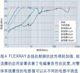 物理層應用指南明確指出了對FlexRay網絡數據線扼流圈的總體要求,比如引線電阻(<1W)、電感(>50mH)以及雜散電感(<1mH)。對電磁輻射和電磁干擾的測定與CAN總線一樣。不過,由于10Mbit/s的更高傳輸率,需要更加仔細地檢查信號完整性。圖4所示為對具有各種電感的扼流圈與不使用扼流圈的測試板進行DPI測定的相應評估結果。圖五所示為使用另一塊測試板進行電磁干擾測量的結果,同樣是針對具有不同電感的扼流圈。很明顯可以發現,數據線扼流圈的使用改善了電磁兼容性并減少了干擾輻射。當電感更高時,作用就更大。不過,更高的電感值會對信號完整性產生一定的負面影響。[page]