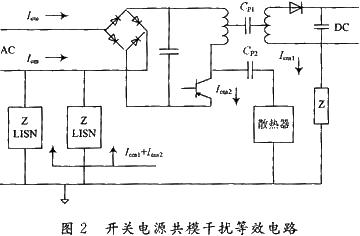 如圖2所示,當(dāng)開關(guān)管轉(zhuǎn)為“關(guān)”時,集電極與發(fā)射極間的電壓快速上升達500V,他產(chǎn)生的電流經(jīng)集電極與地之間的分布電容返回整流橋,這個按開關(guān)頻率工作的脈沖串電流是共模噪聲。這個電壓會引起共模電流Icm2向CP2充電和共模電流Icm1向CP1充電,其中CP1為變壓器初、次級之間的分布電容,CP2為開關(guān)電源與散熱器之間的分布電容(即開關(guān)管集電極與地之間的分布電容)。則線路中共模電流總大小為Icm1+Icm2。