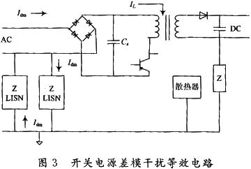 如圖3所示,當(dāng)開關(guān)管轉(zhuǎn)為“開”時,儲能電容Cs的能量由AC電網(wǎng)和整流橋提供,他被開關(guān)管變換器的快速開關(guān)頻率所變換,并通過變壓器形成脈沖電流IL,他具有非常豐富的開關(guān)頻率諧波。儲能電容不是一個純電容,他有串聯(lián)電阻和電感。當(dāng)整流橋處開關(guān)管“開”時,在AC電網(wǎng)端,IL會產(chǎn)生一個由電容的L,R,C所呈現(xiàn)的阻抗電壓,這就是開關(guān)電源產(chǎn)生差模發(fā)射源的原理。差模電流Idm和信號電流IL沿著導(dǎo)線、變壓器初級、開關(guān)管組成的回路流通。