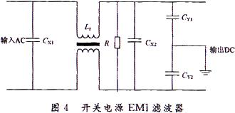 濾波是抑制傳導(dǎo)干擾的一種很好的辦法。在電源輸入端接上濾波器,即可以抑制開關(guān)電源產(chǎn)生并向電網(wǎng)反饋的干擾,也可以抑制來自電網(wǎng)的噪聲對電源本身的侵害。開關(guān)電源的工作頻率一般在10~130kHz,對開關(guān)電源產(chǎn)生的高頻段EMI信號,只要選擇相應(yīng)的去耦電路或網(wǎng)絡(luò)結(jié)構(gòu)較為簡單的EMI濾波器,就能達到理想的濾波效果。干擾抑制電路如圖4所示,CX1和CX2叫做差模電容,L1叫做共模電感,CY1和CY2叫做共模電容。電阻R用于消除可能在濾波器中出現(xiàn)的靜電積累。IEC-380安全技術(shù)條件標準的8.8部分指出,若CX>0.1μF則R=t/2.2C(t=1s,C=2CXμF)。